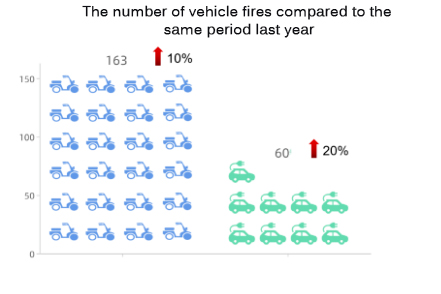 Ifølge data fra Guangdong brannvern var det 163 branner på elektriske sykler. i første kvartal 2022 , et år på år- årlig økning på 10 % , og 60 branner i elektriske eller hybride kjøretøy, en økning på 20 % fra år til år.